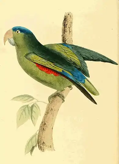 I think this may be the bird described (according to Latham) by Sonnerat, under the name of Petite perruche de Malacca, and from which both Latham and Shaw have framed their account of the Blue-rumped Parrot. On comparing their descriptions with the following, some differences and omissions will be found, but not sufficient, I think, to justify the idea of this being a distinct species: I have, as yet, seen only one specimen (and that not perfect) of this rare and little known bird.