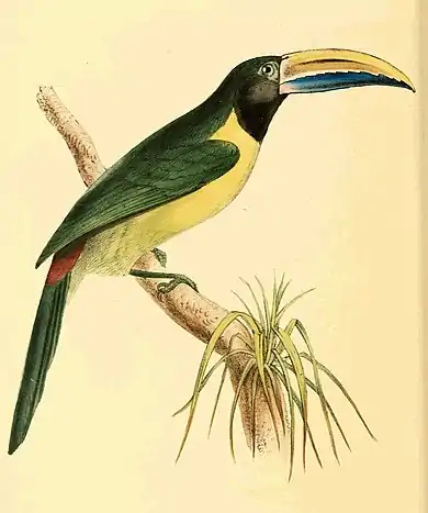 This is a common bird, known to the older ornithologists; but here introduced, for the purpose of representing the vivid colours which ornament the bill of the live bird: the figures likewise above referred to are so very loosely drawn, that a more correct representation of the species appeared desirable. A remarkable character pervades all the Aracaris, (with the exception of P. sulcatus, pl. 44,) the head and throat being black in the male, and chesnut or grey in the female birds; the bills also of the latter are always the smallest; that of the Green Aracari is larger, thicker, and more curved than in any other species; the serratures strong and unequal; the top, and upper half of the superior mandible, pure yellow; the lower half orange; these colours being divided by a slender isolated black line; the under mandible blue, with the base rosy; its general plumage bears a resemblance to several other species. Dr. Latham says the orbits are yellow; this, however, is a mistake, for both the orbits and irides are grass-green; this writer likewise refers to Edwards, pl. 329, for this bird; which plate, in fact, represents a Toucan, and is that bird which I have described and figured under the name of R. carinatus, pl. 45.